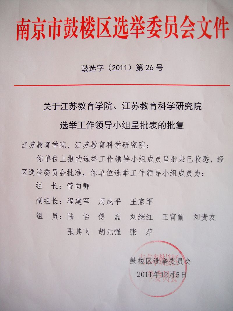 各院(系、部)、所(中心、室)、部门, 浦口、小行校区管委会: 我院选举工作领导小组名单报经南京市鼓楼区选举工作委员会批复,现公布如下(详见附件)。