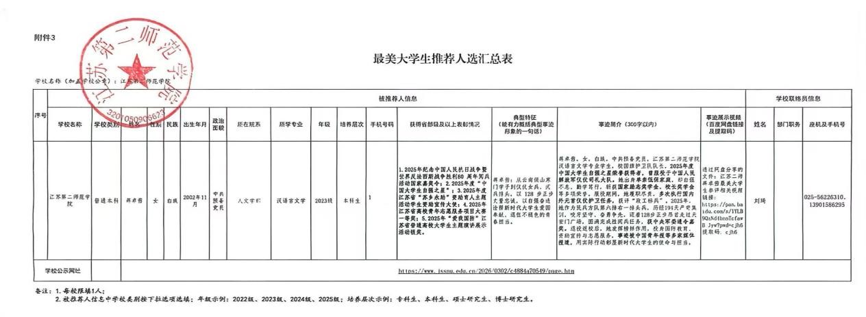 公示日期为2026年3月2日至3月6日。如有异议,请于2026年3月6日前反馈至学生工作处。联系人:刘老师,联系电话:025-56226310,13901586295。